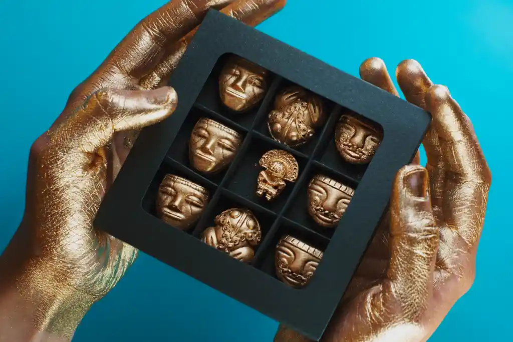 El Dorado está compuesta por 9 piezas diferentes inspiradas en las figuras precolombinas. todas en *chocolate semi-amargo al 45% cacao de origen colombiano. Una invitación a conocer y apropiarnos de nuestro territorio.El oro. en el saber de los indi?genas. es la energi?a de vida del padre sol, las lagunas son el vientre de la madre tierra.Cuando desde la balsa el cacique dorado arrojaba oro y ofrendas a las aguas. pactaba con la naturaleza la renovacio?n de la vida.” “El Dorado”. nuestra u?ltima coleccio?n #AltaGracia. Inspirada en nuestras rai?ces. en los ori?genes del Universo y la humanidad segu?n el conocimiento ancestral de los primeros pueblos indi?genas.Una invitacio?n a adentrarnos en la historia de nuestro continente. Los invitamos a descubrir con nosotros el tesoro del Dorado y emprender un viaje en el tiempo. Un viaje a la Ame?rica Precolombina a través de chocolate semiamargo.