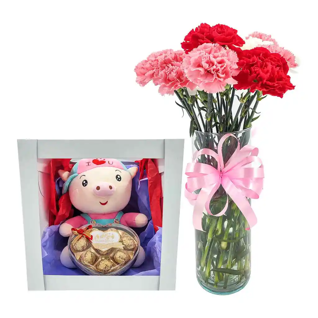 Florero de vidrio con claveles naturales , caja de carton reciclable que incluye peluche de cerdito y caja de chocolates de 8 unidades