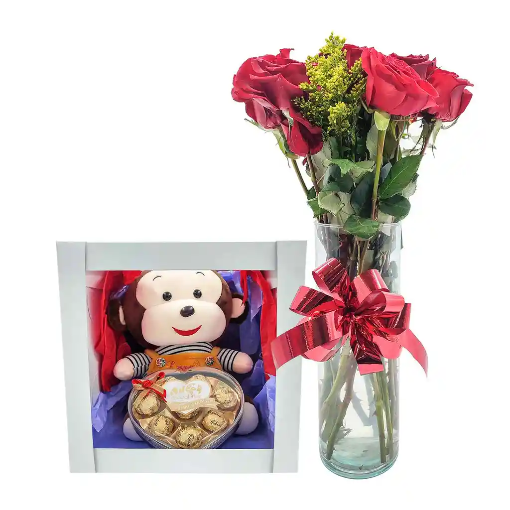 Florero en vidrio con rosas rojas, peluche de felpa mono y caja de chocolates de 8 unidades