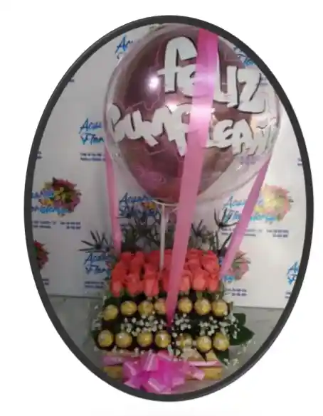 Globo siliconado en base cuadrada con Follaje, 30 rosas y chocolates Roché