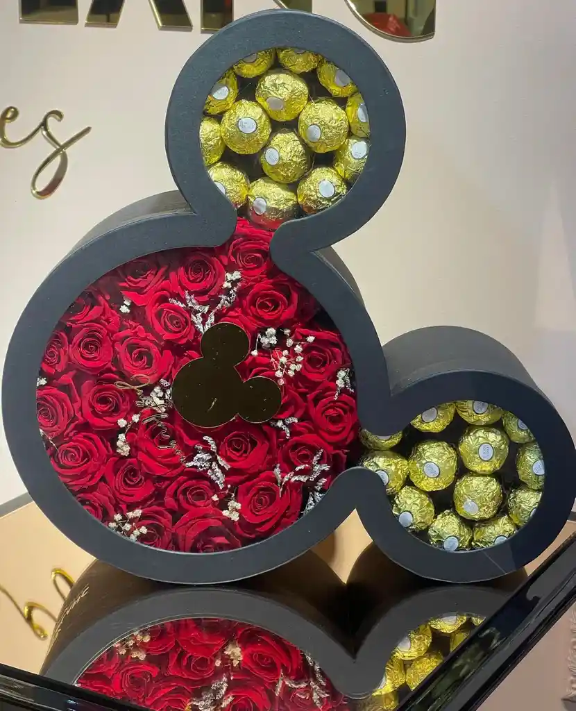 Caja de rosas naturales Mickey Mouse con chocolates Ferrero Rocher