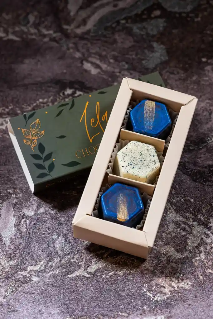 Chocolates Artesanales con doble relleno Ganache de chocolate y maní en semiamargo Arequipe y brownie en blanco