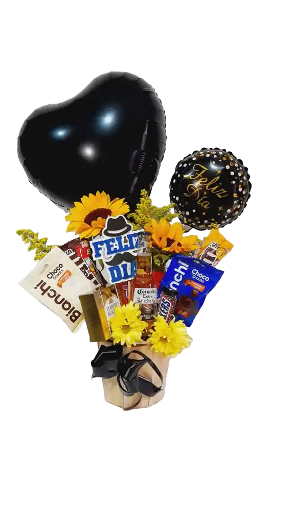 Cubeta de madera decorada que contiene: Caja con cuatro chocolates Ferrero Rocher x1 (una) unidad; Girasoles x2 (dos) unidades; Margaritas x4 (cuatro) unidades; Decoración "Feliz Dia" x1 (una) unidad; Paquete con dulces BIANCHI x2 (dos) unidades; M&M's x2 (dos) unidades; Cerveza Corona x 355ml x1 (una) unidad; Chocolates Snickers x1 (una) unidad; Paquete Gomas Trululu. x1 (una) unidad; Mensaje Personalizado x1 (una) unidad.