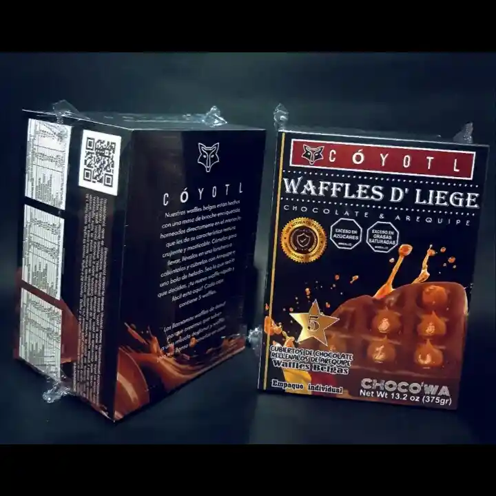 Caja Dispaly 5 Waffles Belgas individuales cada uno cubierto de chocolate y acompañados de un sachet de 15gr. de Arequipe