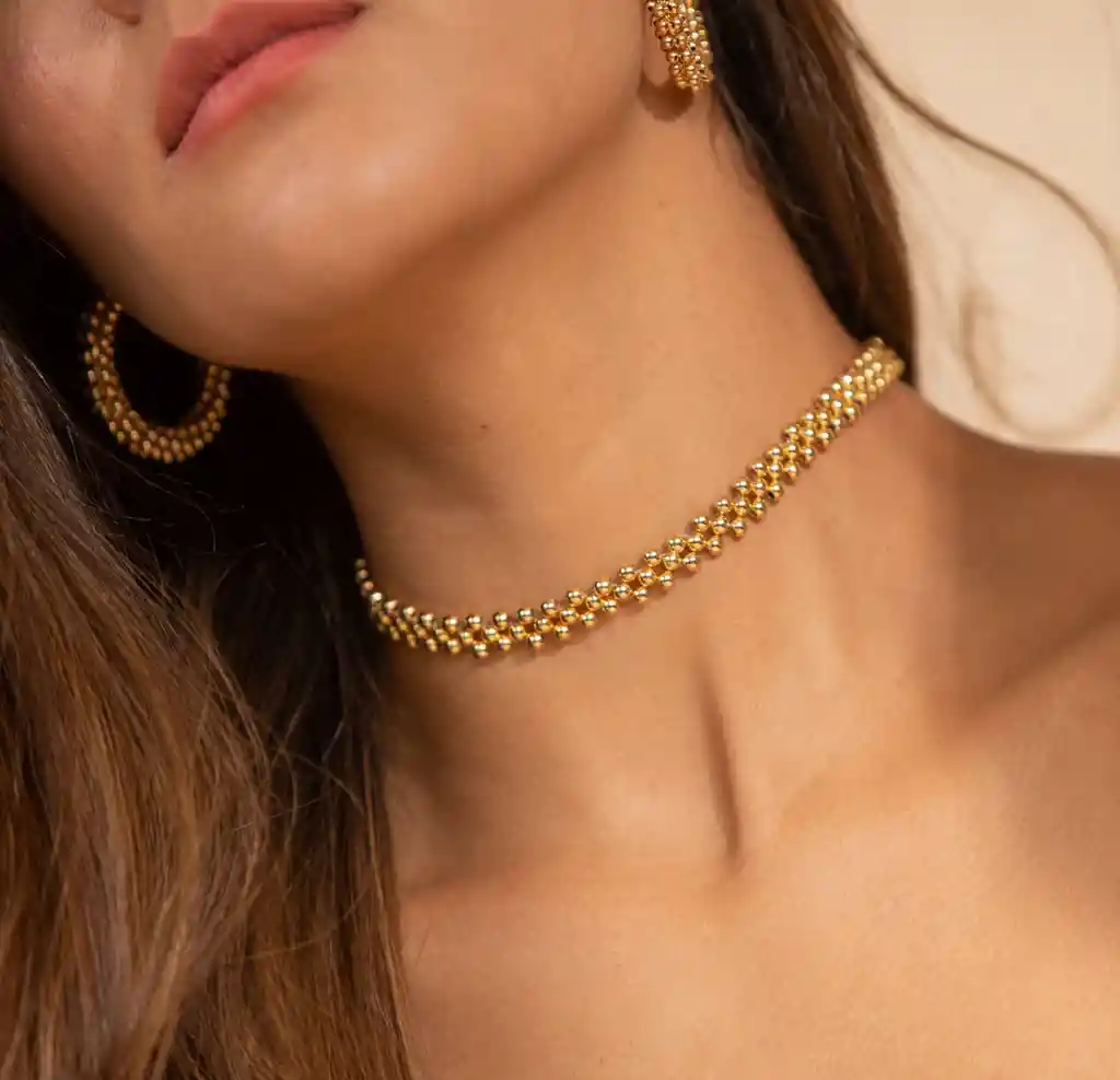 Choker tejido en balin dorado. (Precio por unidad) Material: cover gold Medidas: 33 cms Cuidados: Recomendamos guardar por separado cada accesorio, almacenarlos en lugares secos y a temperatura ambiente; limpiarlos con un pañito o franela y sin ningún tipo de producto, evitar contacto con productos químicos como cremas y perfumes, no dormir ni bañarse con ellos. La durabilidad de los accesorios depende 100% del cuidado de cada persona.