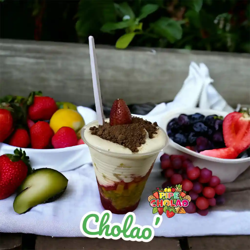 Raspadito con jarabe de sabor con todas las frutas, mango, piña, banano, maracuyá, guanábana y fresa, con deliciosa crema de la casa bañada en lechera y milo, también con cuchara comestible