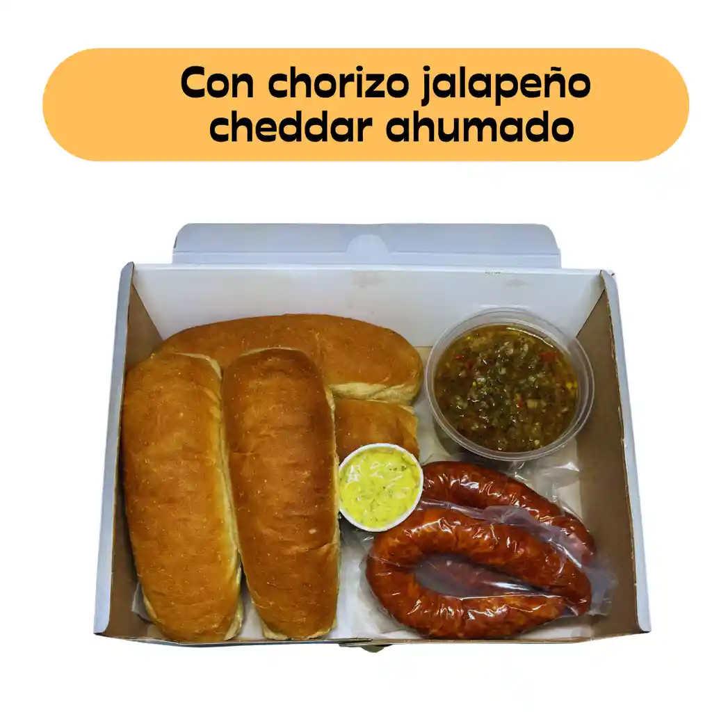Cuatro deliciosos panes artesanales de la casa con cuatro porciones de chorizo jalapeño cheddar ahumado. Incluye mantequilla de ajo y salsa chimichurri