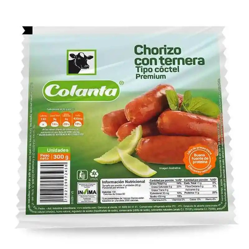 CHORIZO CON TERNERA PREMIUM COLANTA 300 GR X 20 UND