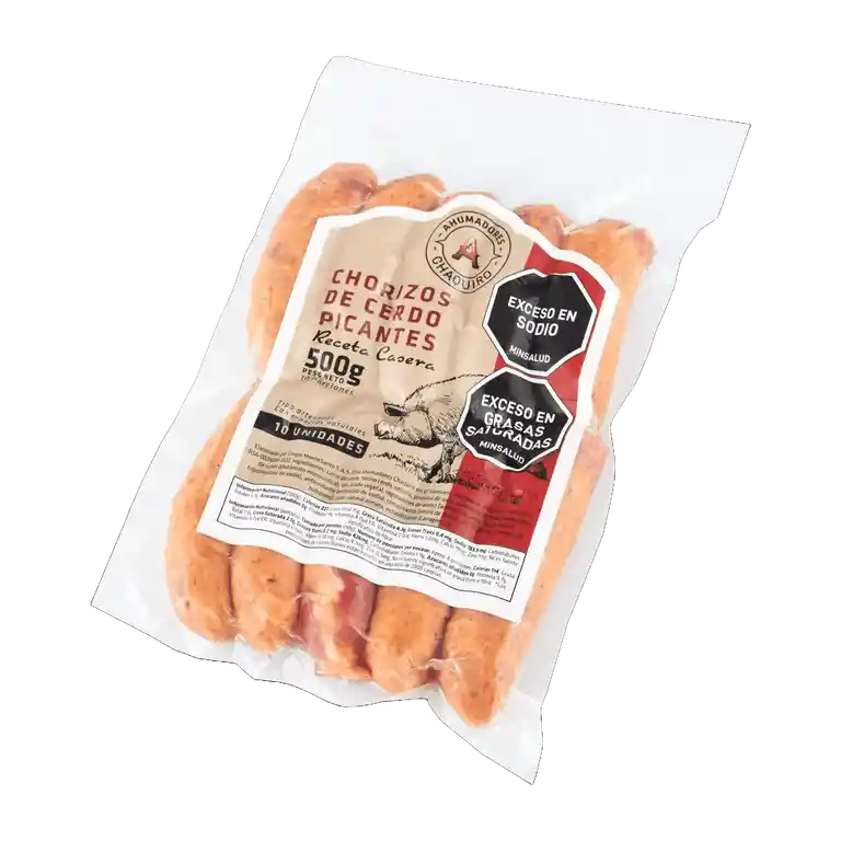 Chorizos Picantes de cerdo marca propia. Tipo artesanal con especias naturales. Contenido aproximado de 500 gramos y de 10 unidades.