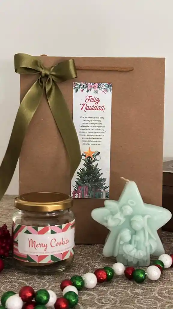 Un detalle perfecto para estas fiestas. Bolsa Kraft, Tarro con galletas, Vela aromatizada, Tarjeta Navideña Recomendaciones: Al realizar la compra te aconsejamos comunicarte al Whatsapp: 3102078219 para ultimar detalles.