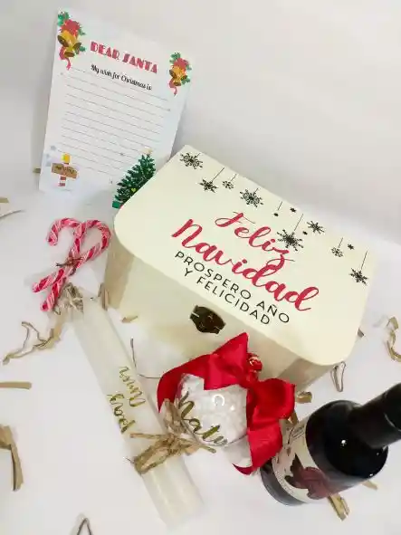 Hermosa caja decorada incluye 3 velas para deseos , vino pequeño. bolita navideña personalizada , bastones de navidad y tarjeta de deseos.
