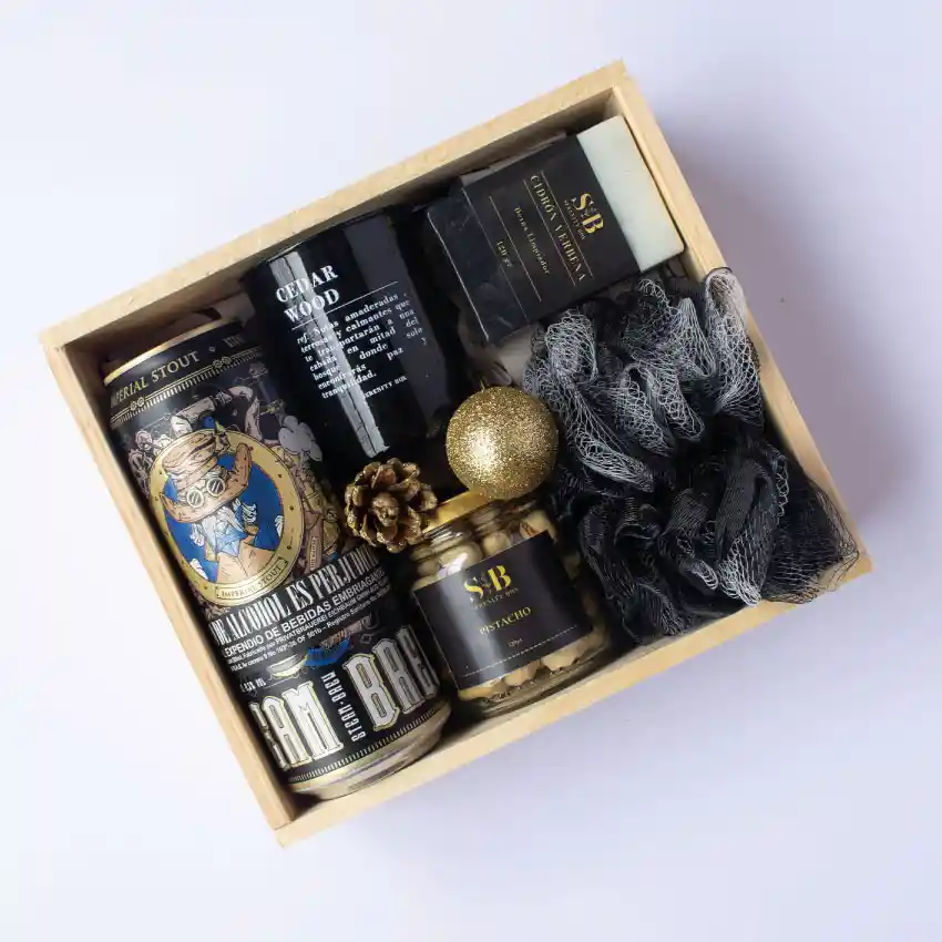 Vela con aroma a cedro Jabón de carbón frasco de pistachos Esponja de baño de carbón Cerveza importada Postal Caja de madera