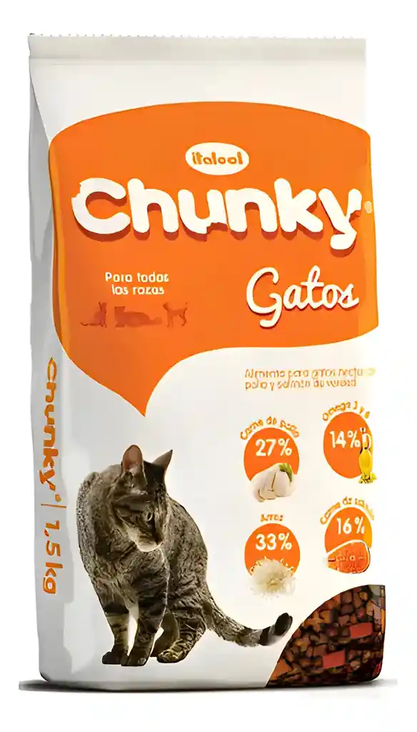 Alimento Seco Chunky Gatos Adultos Sabor Pollo 8 kg, formulado con proteína de pollo de alta calidad que aporta energía, vitalidad y ayuda a mantener la masa muscular. Contiene fibra natural que favorece la digestión y reduce la formación de bolas de pelo. Enriquecido con vitaminas, minerales y ácidos grasos esenciales para una piel sana y un pelaje brillante. Su sabor y textura lo hacen altamente apetecido por los gatos. Ideal para gatos adultos de todas las razas.