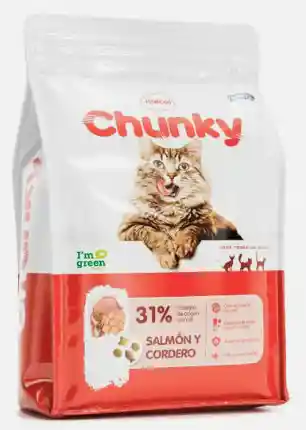 Chunky Gatos Salmón Y Cordero Presentación 8 Kg Alimento Seco Para Gatos Adultos Ingredientes: Harina de pollo, arroz cristal, salmón, cordero, aceite de pollo, salvado de trigo, hidrolizado higado de pollo, celulosa, cloruro de sodio, manano-oligosacaridos, bisulfato de sodio, hierro quelado, sulfato ferroso, hidroxicloruro de zinc, zinc quelado, selenio quelado, cobre básico cloruro, cobre quelado, yodato de calcio, hidroxicloruro de manganeso, manganeso quelado, selenito de sodio, taurina, vitamina E tocoferol acetato, vitamina A retinol, vitamina B1 tiamina, vitamina B2 riboflavina, vitamina B3 niacinamida, vitamina B5 ácido pantoténico, vitamina B6 piridoxina, vitamina B9 ácido fólico, vitamina B12 cianocobalamina, vitamina H biotina, vitamina K3 menadiona, vitamina D3 colecalciferol, fosfato dicálcico, azufre, extracto de yucca schidigera, sales de ácido propiónico, tocoferoles y aceite de romero, ácido cítrico, color natural carmín.