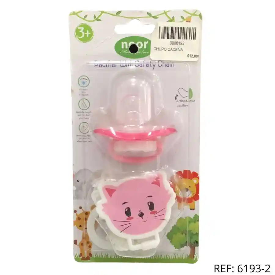Chupo ortodóntico con cadena y diseño de gatito. Perfecto para bebés desde 3 meses. Cómodo, seguro y divertido.