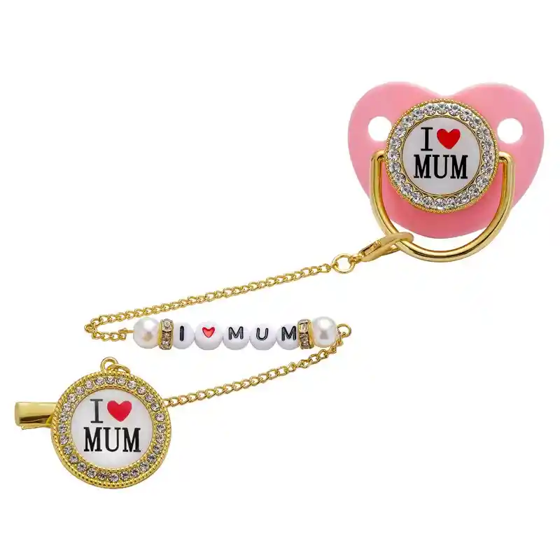 Este hermoso y lujoso chupete de oro le ayuda a su bebé a estar tranquilo y aliviar las encías de picazón, a estabilizar su estado de ánimo, a mover ell cerebro y a un desarrollo saludable de la mandíbula. Cuenta con forma de pezón para que pueda ejercer la capacidad de chupar y adaptarse a la forma del amamantamiento del bebé, incluso cuenta con un manguito de anillo portátil y clips de cadena. El chupete está elaborado con silicona que es seguro, liso y duradero. Libre de BPA. Características: -Pezón de silicona ultrasuave, sin cara de tarjeta, buen gusto de succión. -Las diferentes letras tienen importancia conmemorativa. -El chupete tiene un clip de cadena para evitar que se caiga. Atención de desinfección por favor: -No ponga todo el chupete en agua hirviendo, ya que hay diamantes de imitación y pegatinas 3M. -Solo el pezón se puede desinfectar con agua hirviendo, las otras partes solo se pueden limpiar, de lo contrario los diamantes de imitación y las pegatinas 3M se caen fácilmente.
