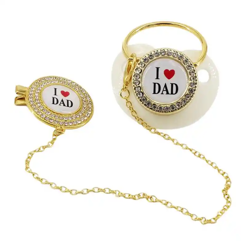 Este hermoso y lujoso chupete de oro le ayuda a su bebé a estar tranquilo y aliviar las encías de picazón, a estabilizar su estado de ánimo, a mover ell cerebro y a un desarrollo saludable de la mandíbula. Cuenta con forma de pezón para que pueda ejercer la capacidad de chupar y adaptarse a la forma del amamantamiento del bebé, incluso cuenta con un manguito de anillo portátil y clips de cadena. El chupete está elaborado con silicona que es seguro, liso y duradero. Libre de BPA. Características: -Pezón de silicona ultrasuave, sin cara de tarjeta, buen gusto de succión. -Las diferentes letras tienen importancia conmemorativa. -El chupete tiene un clip de cadena para evitar que se caiga. Atención de desinfección por favor: -No ponga todo el chupete en agua hirviendo, ya que hay diamantes de imitación y pegatinas 3M. -Solo el pezón se puede desinfectar con agua hirviendo, las otras partes solo se pueden limpiar, de lo contrario los diamantes de imitación y las pegatinas 3M se caen fácilmente.