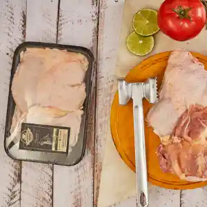 Churrasco de la pierna del pollo, sin hueso, con piel. En bandeja.