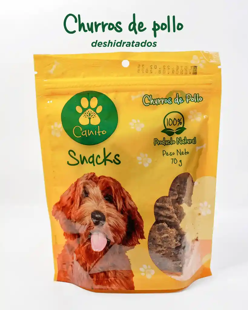 Churros De Pollo Deshidratado, con pollo natural, mix de verduras. No contiene carnaza, químicos ni aditivos.