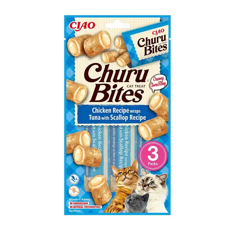 Deliciosos snacks con dos texturas para gatos: una masa de pollo horneada suave y masticable en el exterior y un cremoso relleno de Churu de atún y scallop en el interior. Estos bocados únicos contienen un 72% de humedad para ayudar a mantener a tu gato hidratado. También cuenta con vitamina E para apoyar su sistema inmunológico y extracto de té verde por sus propiedades antioxidantes. Cada golosina del tamaño de un bocado tiene solo 13 calorías, lo que hace que sea un regalo saludable.