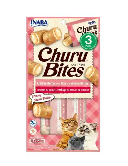 Churu Bites Chicken Wraps salmón 3 Unds 10 g pollo y salmón para gatos están hechas con un exterior horneado suave y un relleno cremoso en el interior para obtener dos texturas deliciosas en un solo bocado. Están elaborados con pollo 100 % puro y salmón