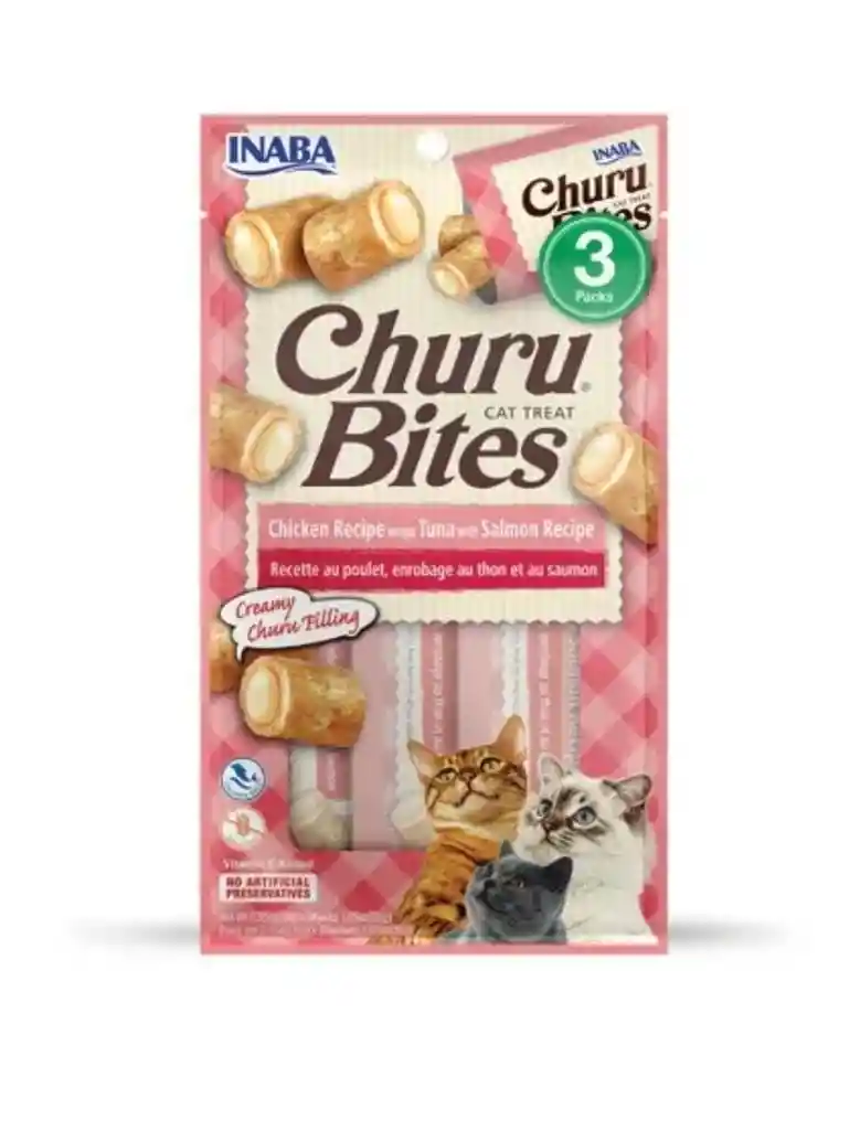 churu bites es un snack perfecto para consentir a tu felino con una deliciosa combinación de texturas, el exterior, una masa de pollo crocante y masticable. Y el interior un cremoso relleno de atún.