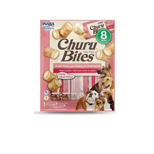 Deliciosos snacks con dos texturas para perros: una masa de pollo horneada suave y masticable en el exterior y un cremoso relleno de Churu de pollo y salmón en el interior.