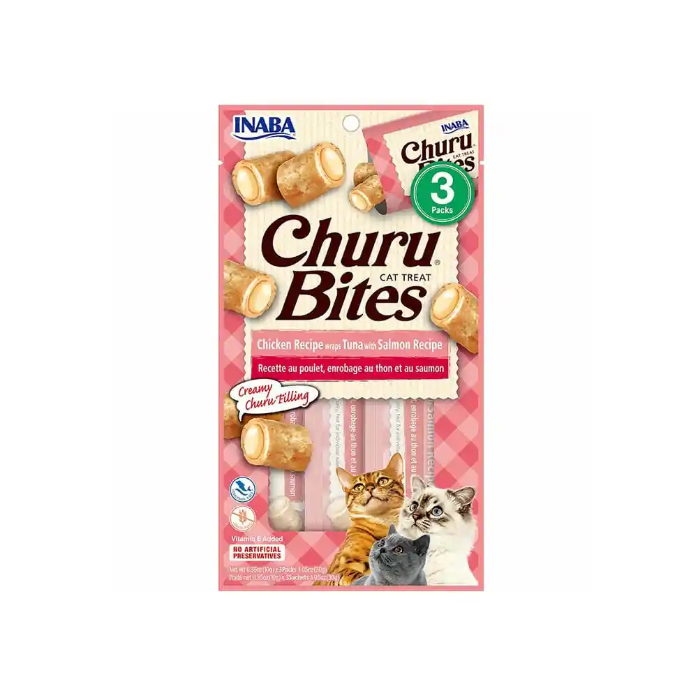 Los Churu Bites Chicken Recife Tuna Salmon - 3 unidades (rosado) son deliciosos snacks para gatos, elaborados con ingredientes de alta calidad como pollo, atún y salmón. Estos premios tienen una textura única: un exterior suave horneado y un relleno cremoso en el centro, lo que los hace irresistibles para los felinos. Además, están enriquecidos con vitamina E para el sistema inmunológico y extracto de té verde como antioxidante natural. Son libres de granos, conservantes y colorantes artificiales, lo que los convierte en una opción saludable