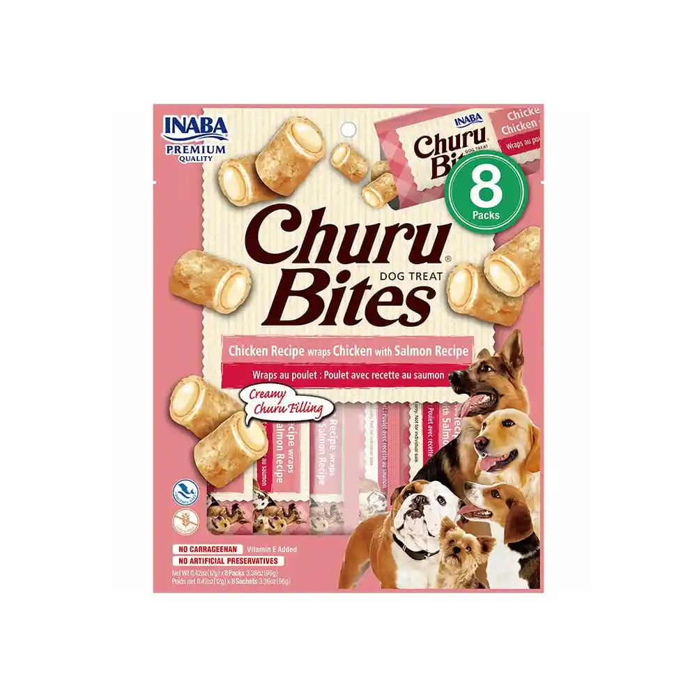 Los Churu Bites Dog Chicken Recipe Salmon - 8 unidades (rosado) son deliciosos snacks para perros, elaborados con ingredientes de alta calidad como pollo y salmón. Estos premios tienen una textura única: un exterior suave horneado y un relleno cremoso en el centro, lo que los hace irresistibles para los perros. Además, están enriquecidos con vitamina E para el sistema inmunológico y extracto de té verde como antioxidante natural. Son libres de granos, conservantes y colorantes artificiales, lo que los convierte en una opción saludable
