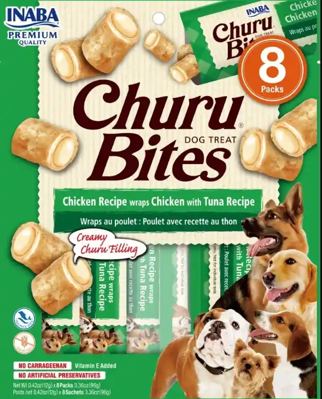 Churu Bites es el snack perfecto para consentir a tu perro con una deliciosa combinación de texturas. En el exterior, una masa de pollo horneada suave y masticable, y en el interior, un cremoso relleno de Churu de pollo y queso. Estos bocados únicos contienen un 72% de humedad para mantener a tu perro hidratado, además de vitamina E para apoyar su sistema inmunológico y extracto de té verde por sus propiedades antioxidantes. Cada golosina del tamaño de un bocado tiene solo 16 calorías, lo que hace que sea un regalo saludable y delicioso para tu perro.