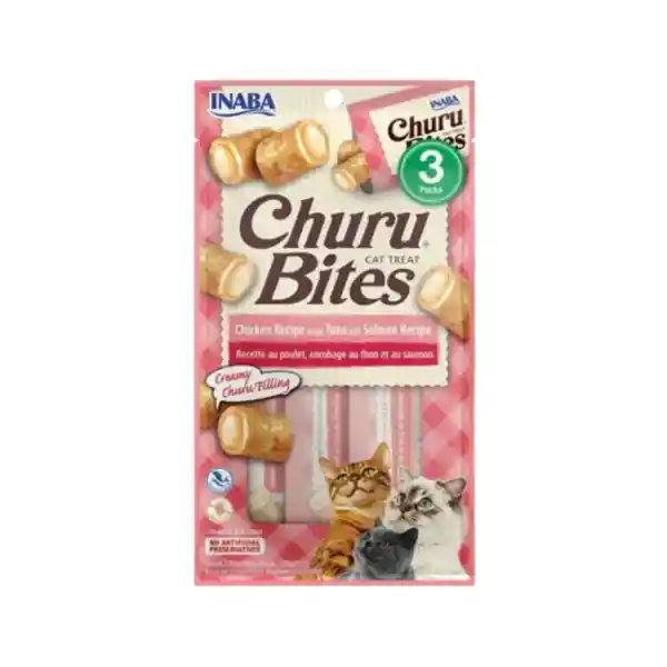 Los Churu Bites son una opción de snack natural y suave para gatos, presentados en una atractiva forma de almohada. Están sazonados con sabores naturales y fortificados con extracto de té verde y vitamina E. La combinación de pollo, atún salvaje y salmón del Pacífico ofrece una experiencia de sabor única y nutritiva para tu mascota.