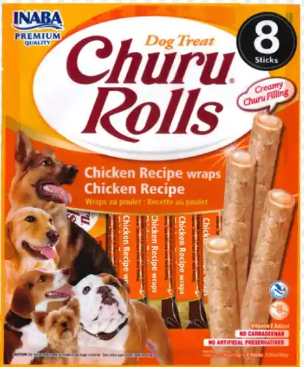Churu Bites Chicken Recipe Wraps, es un snacks para perros que está hecho con deliciosos ingredientes de alta calidad, incluyendo pollo de granja y/o atún natural capturado en la naturaleza. Churu está hecho con una suave pasta de pollo al horno sin granos, conservantes, carragenanos ni colorantes artificiales. Cada unidad contiene un 72% de humedad para la hidratación y unas 16 kcal, lo que las convierte en un snack bajo en calorías que ayudará a una excelente nutrición. También contiene vitamina E para reforzar el sistema inmunitario y extracto de té verde como antioxidante.