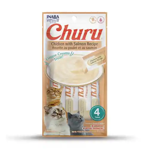 INABA CAT SNACK CHURU 4 PIEZAS - CHICKEN WITH SALMON - POLLO Y SALMON 56 GR Snack cremoso elaborado con ingredientes de alta calidad. Libre de granos, colorantes y preservantes artificiales. Fortalecido con Vitamina E, taurina y té verde. INGREDIENTES: Agua, pollo, almidón de tapioca, salmón, sabores naturales, sabor natural de ostión, goma guar, suplemento de vitamina E, taurina, extracto de té verde. INSTRUCCIONES DE USO: Dar a tu gato como premio. Una vez abierto manténgase refrigerado y consumir lo antes posible.