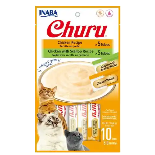 Churu, snack para gato. Paquete de 5 tubos churu pollo y 5 tubos pollo con scallop. En total 10 tubos, cada uno por 14 gr, para un total de 140 gr.