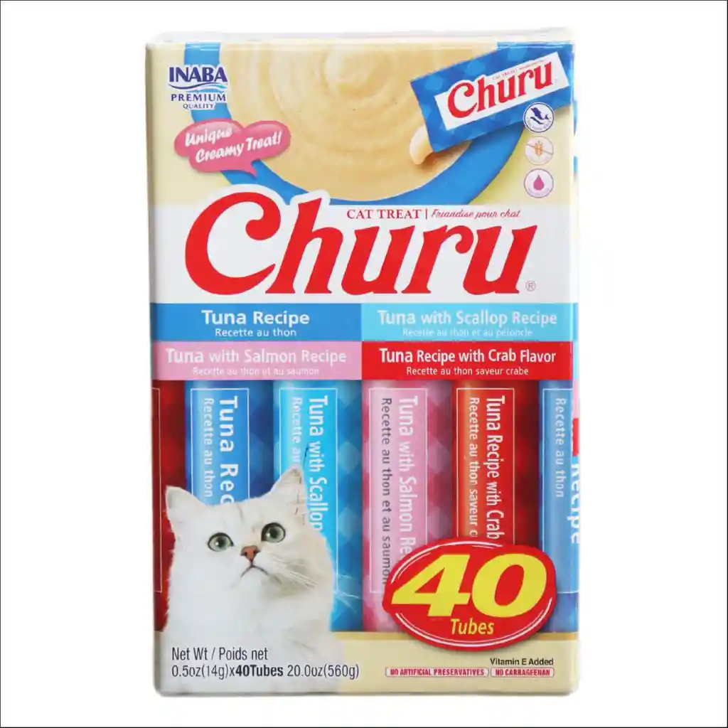 El snack cremoso Cat Treat de Churu redefine la forma de premiar y cuidar a los gatos adultos con una mezcla equilibrada entre nutrición y sabor gourmet. Esta fórmula está enriquecida con vitamina E, un antioxidante esencial que fortalece el sistema inmunológico y favorece la salud general de tu gato. Su textura cremosa y de alta palatabilidad lo convierte en una elección ideal para gatos exigentes. Ingredientes Receta de Atún: Agua, atún, almidón de tapioca, sabores naturales, goma guar, sabor natural a atún, suplemento de vitamina E. Receta de Atún con Vieira: Agua, atún, vieira, almidón de tapioca, sabor natural a vieira, sabores naturales, goma guar, suplemento de vitamina E. Receta de Atún con Salmón: Agua, atún, salmón, almidón de tapioca, sabores naturales, sabor natural a atún, goma guar, suplemento de vitamina E. Receta de Atún con Sabor a Cangrejo: Agua, atún, almidón de tapioca, sabores naturales, goma guar, sabor natural a cangrejo, suplemento de vitamina E. Información del producto Incluye 10 unidades de Receta de atún, 10 unidades de Atún con vieira, 10 unidades de Atún con salmón y 10 unidades de atún con sabor a cangrejo | Se recomienda para gatos a partir de 3 meses | Almacenar en un lugar fresco y seco | Peso Neto: 560 g | Producto de Tailandia.
