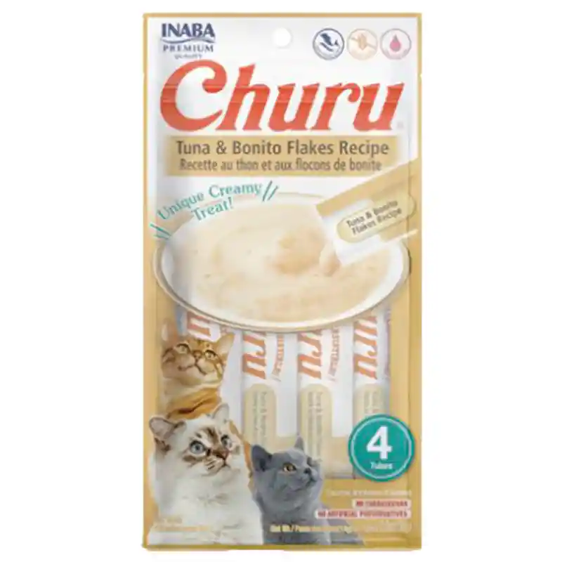 Churu Tuna With Bonito Flakes es un producto que está hecho con deliciosos ingredientes de alta calidad, incluyendo pollo de granja y/o atún natural capturado en libertad Cada delicioso y cremoso tubo de Churu contiene un 91% de humedad y sólo seis calorías (una décima parte de las calorías de las golosinas secas tradicionales para gatos), lo que lo convierte en un snack saludable con el que puedes sentirte bien alimentándolo, no contiene cereales, conservantes, colorantes artificiales y carragenina. Contiene ingredientes especiales como taurina para ayudar a su salud en general.