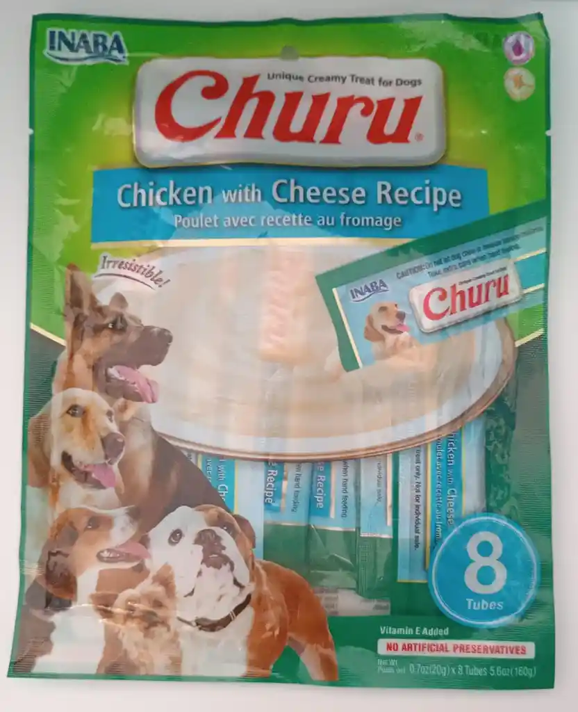 Suplemento alimenticio para perros de todas las razas y tamaños, sabor a pollo con queso. Con vitamina E, sin preservantes artificales. Paquete por 8 unidades de 20 g.