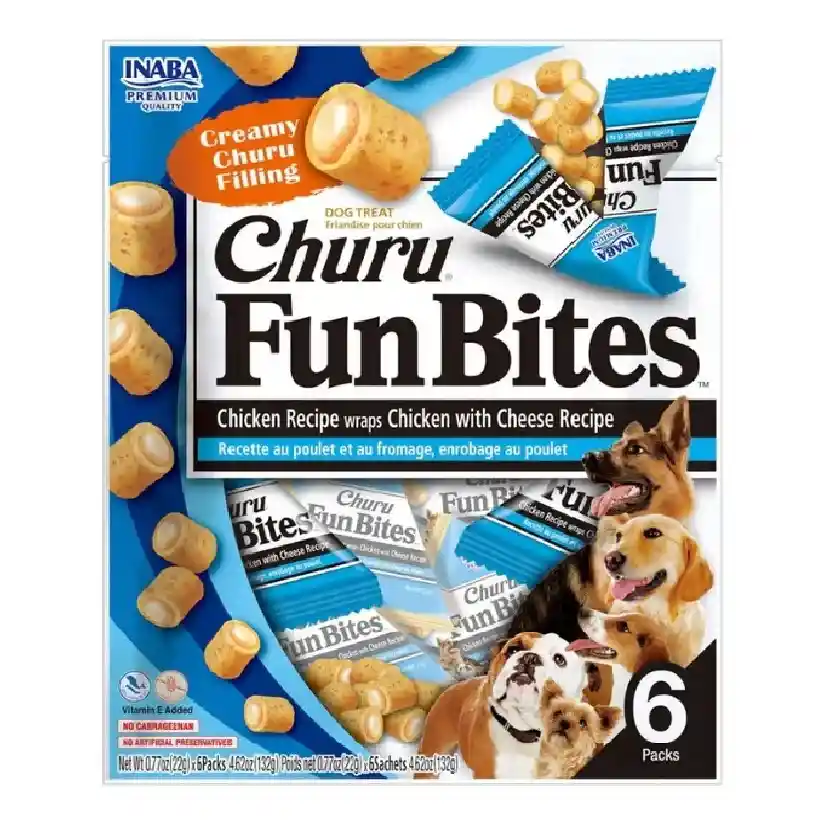 Churu Fun Bites Pollo y Queso – Perro son golosinas de pollo naturales suaves en forma de almohada, con un relleno Creamy Churu en el interior. Elaborado con sabores naturales, extracto de té verde, taurina y vitamina E.