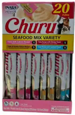 Este pack incluye 20 tubos de snacks cremosos, bajos en calorías, libres de cereales, conservantes y colorantes artificiales. Los sabores disponibles son: Atún con Vieiras, Atún con Salmón, Atún con Sabor a Cangrejo y Atún con Sabor a Camarones.