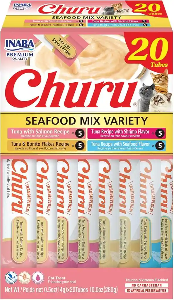 Churu Inaba Tuna Seafood Mix Variety ofrece una gran palatabilidad que ayuda a incentivar el consumo en gatos selectivos, aporta hidratación adicional por su consistencia húmeda y es ideal para reforzar comportamientos positivos, facilitar la socialización o apoyar la administración de medicamentos.