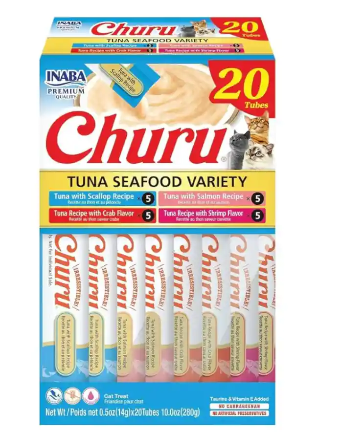 Incluye: 5 Tubos de Atún con Vieira, 5 Tubos de Atún con Salmón, 5 Tubos de Atún con Cangrejo, 5 Tubos de Atún con Camarones. Inaba Churu es un snack para gatos cremoso que le fascinará a tu gato. Hecho con Atún real. Su exquisito sabor y sus ingredientes naturales libres de conservantes y colorantes artificiales prometen convertirse en la golosina favorita de tu gato. Ideal para ayudar a reforzar positivamente conductas.