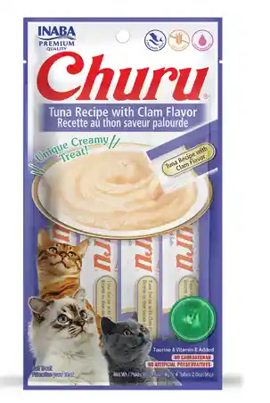 HECHO CON INGREDIENTES SALUDABLES EN LOS QUE PUEDE CONFIAR : Cada producto Inaba está elaborado con deliciosos ingredientes de alta calidad, que incluyen pollo criado en granjas y/o atún salvaje natural. MANTENGA A SU FELINO HIDRATADO SIN AÑADIR CALORÍAS: Cada delicioso y cremoso tubo de Churu contiene 91% de humedad y solo seis calorías (una décima parte de las calorías de las golosinas secas tradicionales para gatos), lo que lo convierte en un refrigerio saludable con el que puede sentirse bien al alimentarlo. LIBRE DE COSAS MALAS : Su amigo felino es importante para nosotros, por eso hemos mantenido cosas como granos, conservantes, colorantes artificiales y carragenina fuera de nuestras golosinas para gatos, pero agregamos cosas como taurina para ayudar con su salud general. HAZ QUE COMAN DE TU MANO : Estos tubos de puré de carne para lamer para gatos fueron diseñados para ser alimentados con la mano como una forma interactiva de pasar tiempo con tu felino, pero puedes usarlos como un aderezo para comida húmeda/seca para gatos o como una forma de disfrazar medicamentos. AGREGUE ALGO DE VARIEDAD A LA VIDA DE SU GATO : Disponible en diecinueve sabores sabrosos, los gatos de todas las etapas (desde gatitos hasta adultos mayores) podrán encontrar un sabor que les encante. Instrucciones de alimentación Adminístrelo como premio a su gato. Este producto no está diseñado para usarse como alimento. Proporciónele agua limpia y fresca a diario. Para la salud de su mascota, consulte a su veterinario regularmente. Instrucciones de almacenamiento Refrigerar después de abrir y servir lo antes posible.