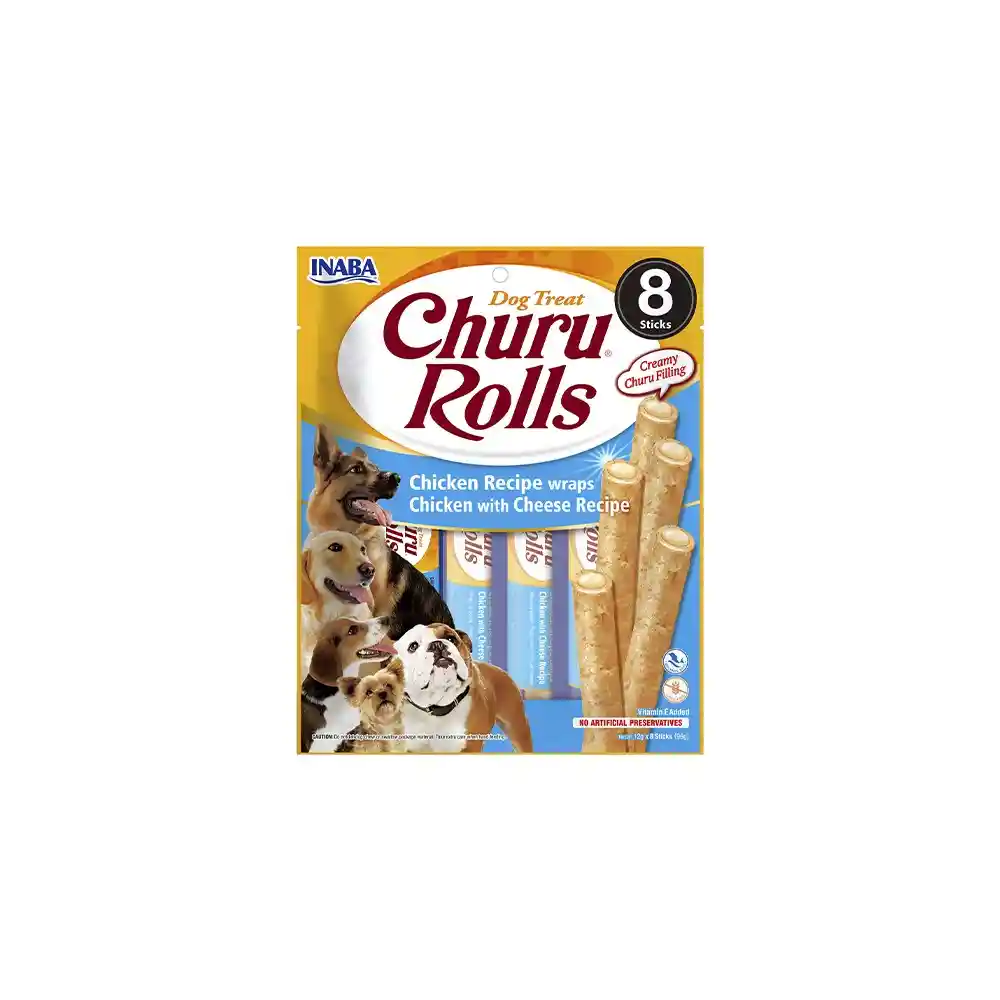 Churu Rolls son golosinas de pollo con queso suaves en forma de palito sazonadas con sabores naturales, extracto de té verde y vitamina E. Sin granos, conservantes ni colorantes artificiales. Cada paquete incluye ocho paquetes de golosinas individuales para mantener la máxima frescura.
