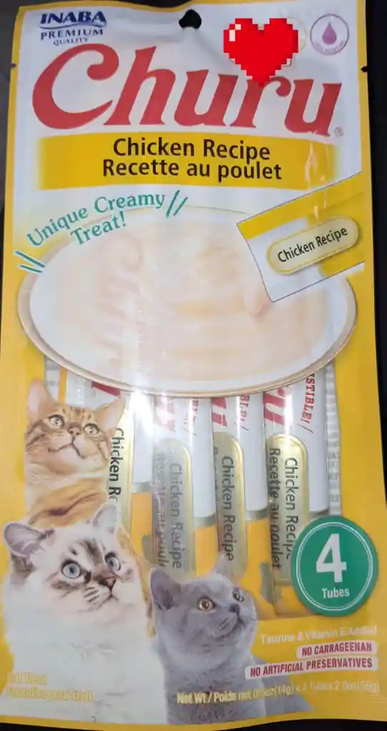 La comida Churu para gatos, con sabor a pollo, es un snack cremoso y natural que está libre de cereales, conservantes y colorantes artificiales. Este producto tiene un alto contenido de humedad (hasta el 91%), lo que es beneficioso para la salud general de los gatos, y contiene solo seis calorías