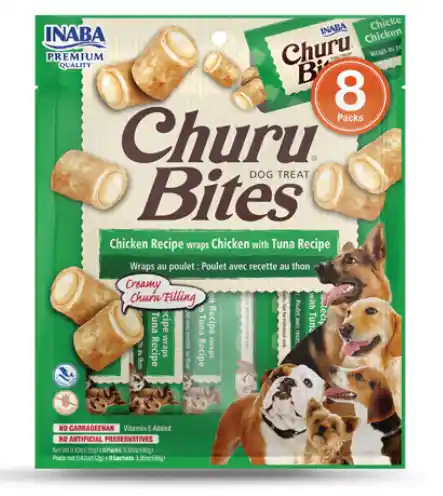 Beneficios y características Deliciosa combinación de pollo y atún en cada Churu Bite. Elaborado en Tailandia con pollo de granja y atún salvaje 100% puro y natural. El relleno cremoso de Churu® en el interior y la suave pasta de pollo al horno en el exterior ofrecen dos texturas diferentes en un solo bocado, brindando una experiencia de masticación satisfactoria y agradable. Sin cereales y sin conservantes Cada paquete contiene ocho paquetes individuales para mantener la máxima frescura. Vienen en forma suave y con forma de almohada, lo que los hace fáciles de manejar y agradables para que su perro los mastique. Sazonado con sabores naturales, garantiza un sabor delicioso que hará que su perro vuelva por más. Con los beneficios adicionales del extracto de té verde y la vitamina E, estas golosinas ofrecen un impulso adicional para apoyar el bienestar general de su perro. Sin colorantes artificiales Sin carragenano
