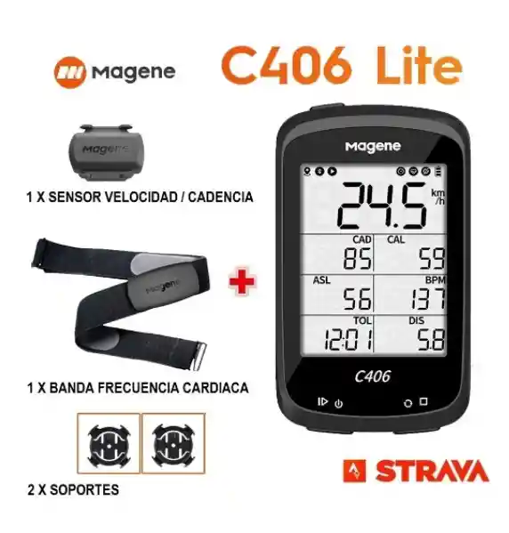 ***Ciclocomputador Magene C406 LITE + Sensor Cardiaco + Cadencia + Soporte*** *Contenido del Paquete : *1 x Ciclocomputador Magene C406 LITE *2 x Soportes Cortos *1 x Sensor Ritmo Cardiaco H64 Magene *1 x Sensor Velocidad/Cadencia Dual S3 Magene *1 x Cable Usb *Marca: MAGENE *Modelo: C406 LITE *Características Técnicas: *Tamaño de pantalla 2,5 pulgadas *Tipo de pantalla LCD *Conexión inalámbrica ANT + / Bluetooth 4.0 *Periféricos compatibles: Sensor de velocidad, Sensor de Cadencia, Sensor de Frecuencia Cardíaca, *Modo de Carga Micro USB *Sensores internos: Altímetro de Presión Atmosférica, Sensor de Temperatura *Batería de Polímero de Litio, 1000 mAh / 3,7 Wh *Tiempo de Carga 3,5 horas (admite carga y uso) *Tiempo de uso 28 horas *Sistema GPS 4 Estrellas (Beidou, GPS, Glonas, Galileo) *Tamaño 7.7 * 5.5 * 1.8 cm *Peso 80grs *Capacidad de Almacenamiento 8 M *Luz de fondo Automática Sí *Sincronización Automática Sí *Numero de Botones: 3 *Zumbador: Si *IPX6 impermeable *Función de Entrenamiento Vuelta, Advertencia de Frecuencia cardíaca, *Número de páginas personalizadas 2 páginas *Datos Mostrados en la Aplicación 36 tipos de datos; 10 gráficos de análisis *Datos Mostrados en el Ciclocomputador *8 clases ( Cadencia, Velocidad, Frecuencia Cardíaca, Pendiente, Distancia, Altitud, Tiempo, Vuelta); *36 Sotrs (Datos promedio, Datos Máximos, Etc.) *Velocidad de Posicionamiento GPS: Se necesitan 90 segundos por primera vez. *30 segundos normalmente. (puede verse afectado por el clima y otros cambios de condiciones) *Exportación y uso compartido de datos Onelap Fitness, Strava (los datos se pueden derivar y compartir mediante la aplicación) *Temperatura de funcionamiento -10 °C -50 °C