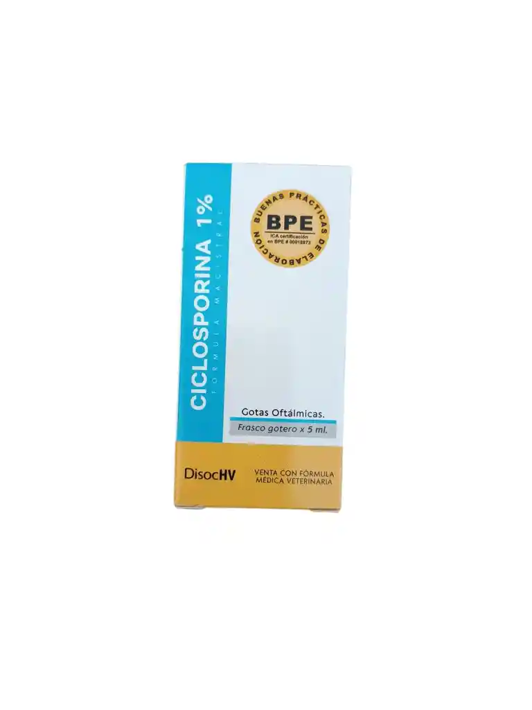 Ciclosporina oftálmica 1% gotas Formula Magistral para Perros y Gatos Ciclosporina Oftálmica 1% actúa como tratamiento inmunomodulador y antiinflamatorio para perros y gatos con queratoconjuntivitis seca (ojo seco) y otras afecciones oculares inflamatorias. Esta fórmula magistral personalizada mejora la producción lagrimal y fortalece la salud ocular de tu mascota. Un médico veterinario debe supervisar su uso para garantizar un tratamiento seguro y eficaz. Uso indicado por un veterinario especializado, preferiblemente un oftalmólogo veterinario. Importante seguir al pie de la letra las instrucciones de administración y dosis recomendadas para garantizar un tratamiento eficaz y seguro. Si se presentan reacciones adversas o cambios en la condición ocular de tu mascota, consulta de inmediato con tu veterinario para realizar los ajustes necesarios. Venta bajo prescripción médica veterinaria. Presentación: Frasco gotero 5 mL