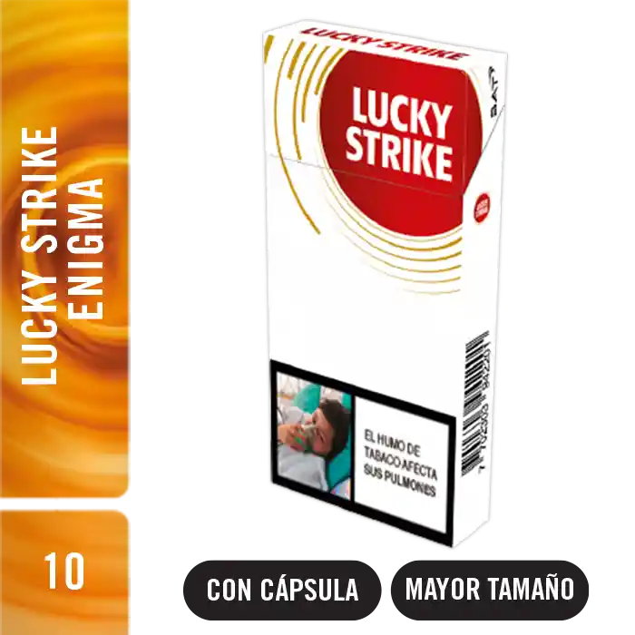 10 Cigarrillos Lucky Strike Enigma, Mayor Tamaño, Cápsula No Mentolada, Sabor A Caramelo.+18 Producto Exclusivo Para Fumadores Mayores De Edad. El tabaco es nocivo para la salud. Ley 30 de 1986. Verificar condiciones de uso, indicaciones y contraindicaciones en la etiqueta. Prohibida la venta a menores de edad