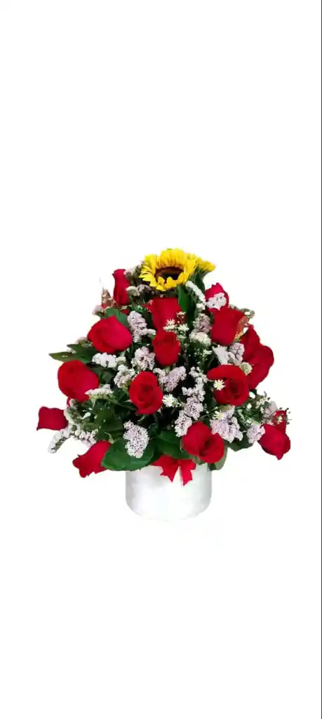 Cilindro en Carton Corrugado grueso, con docena de Rosas Surtidas y un girasol