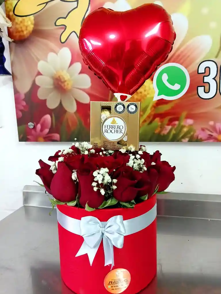 24 unidades de Rosa Roja, en Caja redonda fina, ferrero x 4 Globo metalizado